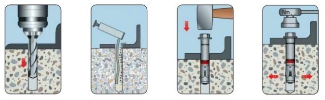 Распорные анкеры крепятся по стандартной схеме. На рабочей поверхности размечаются места фиксации болтов, в них сверлятся отверстия нужного диаметра. Проемы очищаются от пыли и мусора, происходит установка метизов. Болты протягиваются гаечным ключом, при необходимости используется рычаг.