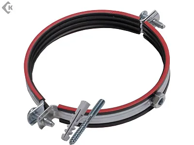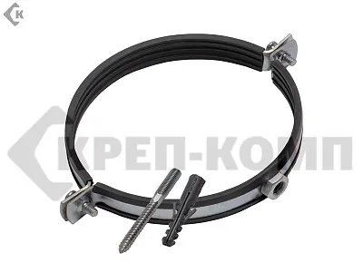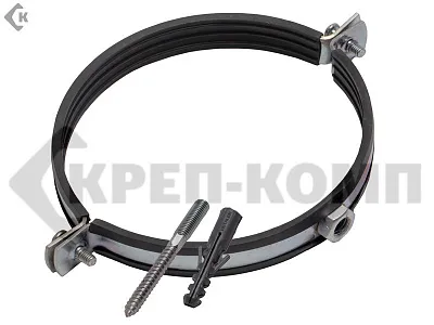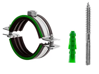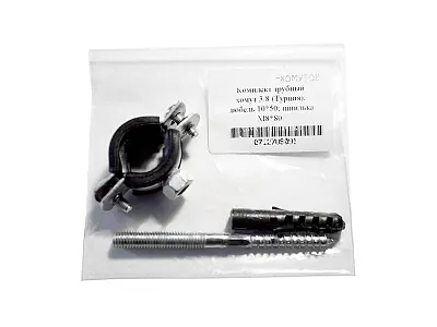 Трубные сантехнические хомуты для розничной продажи укомплектованы полипропиленовым пластиковым дюбелем и сантехнической шпилькой-шурупом. Комплект собирается в пластиковый полиэтиленовый пакетик. В стандартном наборе полипропиленовый дюбель и сантехническая шпилька длиной 80 мм.